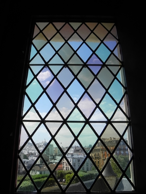 Cidade de Vincennes vista por umas janelas com um desenho de vitral bastante simples no Castelo de Vincennes.