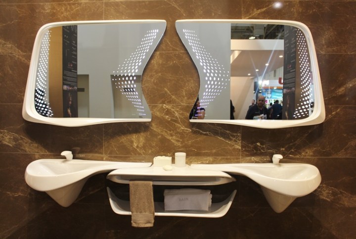 A espanhola Porcelanosa trouxe peças metalizadas e outras mais clássicas, com baixo relevo, além de uma pia projetada pela renomada arquiteta e designer Zaha Hadid – seu último projeto para a marca antes de sua morte em 2016. Unindo porcelanato, mármores e tissue glass, a Tessela tem como compromisso a qualidade e alto padrão, incorporando em alguns de seus produtos os legítimos cristais Swarovski.