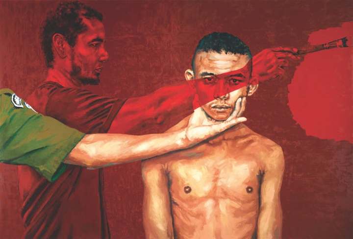 Uma das mais interessantes obras da mostra, em minha opinião, o artista pinta a si mesmo (com o pincel) e um jovem marginalizado do norte do país – também de onde vem o artista – com um policial segurando seu rosto. A cor vermelha remete ao sangue.