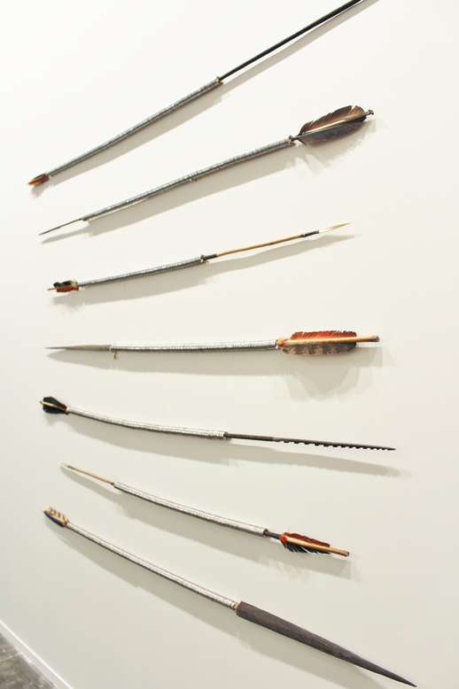 Nas flechas de etnias atingidas pela usina elétrica de Belo Monte, o artista perfurou e perfilou moedas de 50 centavos, inscritas com o lema positivista “Ordem e Progresso”.