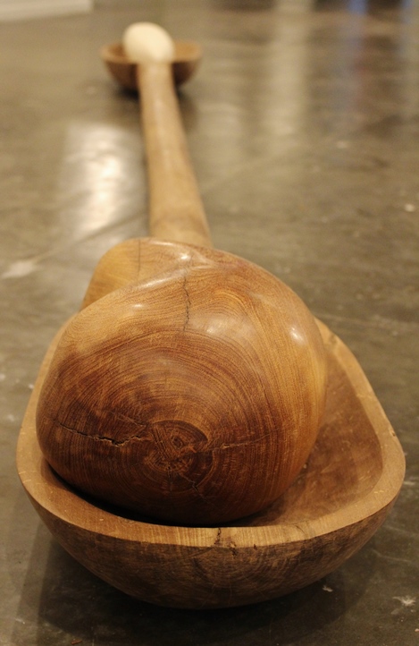 O artista representa uma grande colher de pau, com um grão de arroz e um grão de feijão em cada uma de suas extremidades.