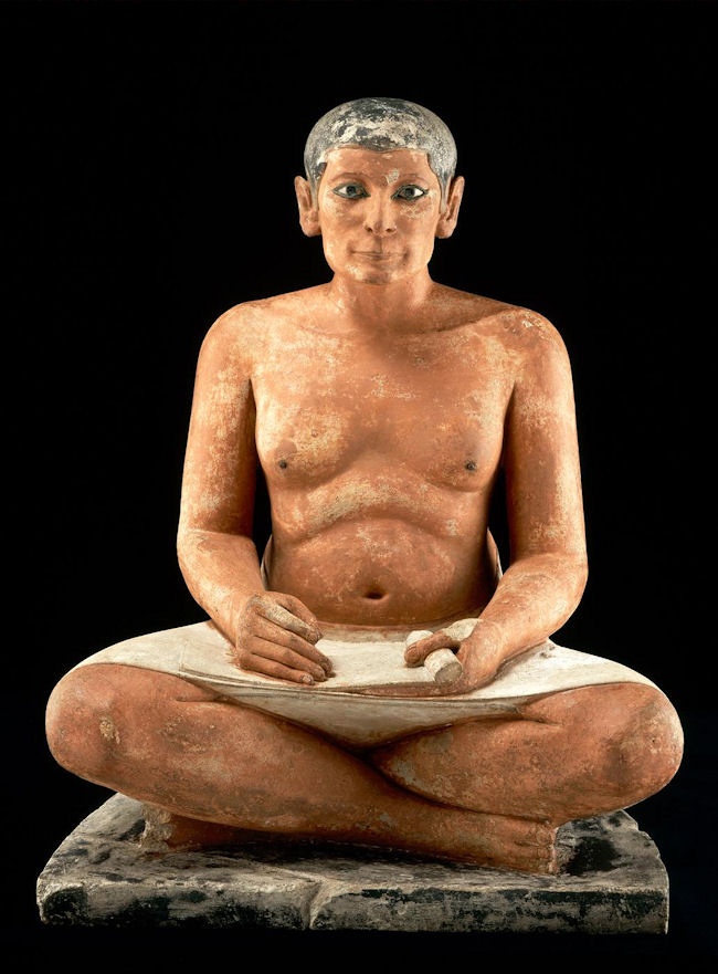 A imagem do escriba foi representada desde as primeiras dinastias, sendo que as estátuas, especificamente, apareceram um pouco posteriormente, durante a 4a dinastia. Inicialmente, elas mostravam membros da família real, que nessa dinastia faziam parte da alta administração e do clero. Entretanto, de maneira geral, a maioria das esculturas de escribas os representa lendo ao invés de escrevendo, como no escriba do Louvre.