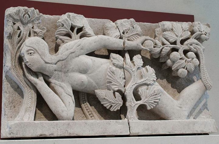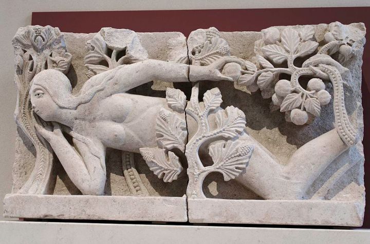 Gislebertus, A tentação de Eva, calcário, 0,72x 1,32x 0,32m, por volta de 1130. Conservada no Musée Rolin, em Autun, França.