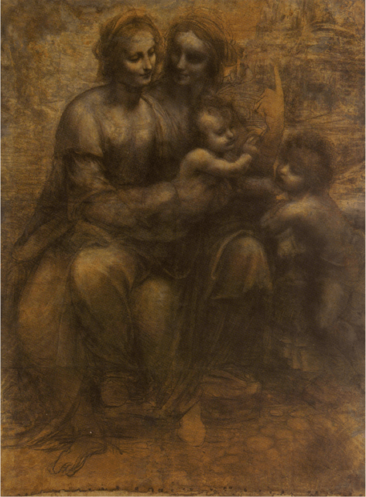 Leonardo da Vinci, Sant’Anna com a Virgem, o menino Jesus e San Giovannino, carvão, lápis negro e gesso branco sobre papel montado em tela, 141,5 x 104 cm, cerca de 1501. Conservada na National Gallery, Londres, Inglaterra.