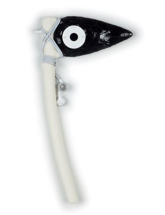 Trata-se da série de esculturas de Luke Newton, jovem artista britânico, retratando o que eu chamo de “iPods das cavernas”. Ele apresenta o famoso iPod envolto em uma camada de resina de uretano trabalhada de maneira a imitar a textura de pedra lascada, como os sílex colocados em pontas de lanças, machadinhos ou outros instrumentos pelos homens pré-históricos para a realização das mais diversas atividades. Ele mistura, então, a mais alta tecnologia da época – a série data de 2011 – a uma ferramenta primitiva. Da mesma maneira, o artista também já representou os botõezinhos do iPod em um escudo medieval. Ou seja, homem contemporâneo se esconde e se protege através da tecnologia, tal como aqueles do passado faziam com seus machados e escudos.