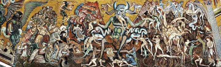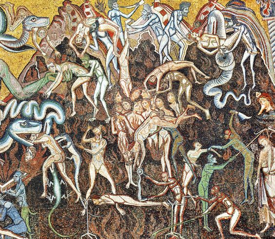 Dentre as muitas figuras e cenas representadas, uma das que chama mais a atenção do visitante é o mosaico do Inferno, o maior desse tipo em toda a Europa, com a imagem imponente de Satã ao centro, rodeado de animais infernais e pecadores torturados. A cena, segundo Irene Hueck próxima às imagens do Inferno em um mosaico em Torcello, perto de Veneza, e em um manuscrito conservado em Paris, faz parte de uma representação maior do Juízo Final sobre o altar. Como é tradicional na arte religiosa, o Inferno está representado à esquerda do Cristo em majestade, enquanto que os benditos estão a sua direita, sendo abençoados por ele. É importante notar a dimensão dada à figura do Cristo, imensamente maior do que as outras personagens, incluindo Satã e toda a cena do Inferno. Somente em relação ao próprio Inferno Satã é gigantesco. Ou seja, através desse programa iconográfico certamente muito bem refletido, a ideia era mostrar àquele que estaria se tornando cristão – o batistério era geralmente aberto somente duas vezes por ano, na ocasião da festa de Pentecostes e da Páscoa para batizar os novos fiéis – o perigo do pecado e das tentações do Diabo, que, entretanto, é vencido pelo poder e pela majestade do Cristo.