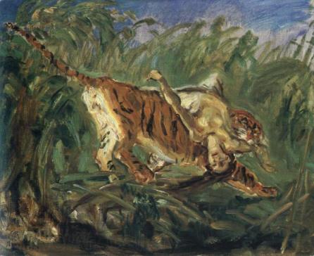 Possuída pela sinuosidade do tigre, todo o corpo da mulher é medo e entrega. O abandono – o saber se consagrar à volúpia do precipício, o saber desistir da luta – é o mais difícil dos sentimentos, e o mais cruel: nunca se sabe se será possível voltar ao que éramos antes, nunca se sabe se não é tarde demais, fundo demais, dolorido demais. A vítima se entrega à ferocidade do desconhecido e, ainda que exista angústia nesse gesto, também há excitação. O gozo anda muito próximo da morte; o prazer caminha ao lado do desespero. Os cabelos da mulher dançam com o vento, enquanto a selva se rende à sensualidade do tigre que carrega o seu prêmio ofegante. A presa não mais resiste; o predador venceu, e a fúria contida da certeza com que seus passos deslizam pela tinta amorfa do quadro é algo de extrema obscenidade. A violência da cena interrompida momentos antes do seu desenlace – o instante em que o animal, enfim, possuirá a mulher já subjugada – nos deixa na incômoda dúvida do reconhecimento impossível de uma cena que jamais vivemos: somos o tigre vitorioso ou a vítima? O vencedor ou o derrotado? Devemos desistir diante da morte semovente ou encará-la mais uma vez nos olhos antes que ela crave seus dentes na nossa carne e nos confronte com o prazer repleto de indecência que mora no primitivo que não conseguimos entender? Temos medo das sombras e segredos que moram no fundo do abismo da entrega.