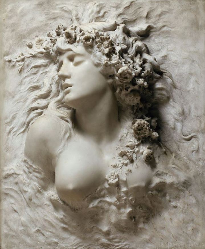Sarah Bernhardt, Ophelia (Ofélia), mármore branco, 70×59 cm, 1880. Coleção particular, Normandia, França.