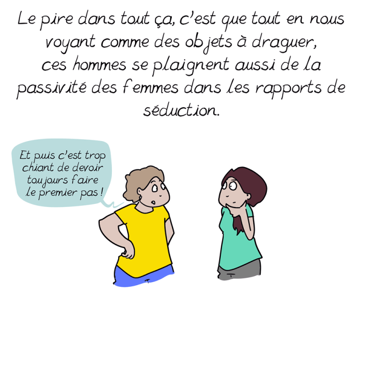 O pior em tudo isso, é que nos vendo como objetos a paquerar, esses homens reclamam também da passividade das mulheres nas relações de sedução.