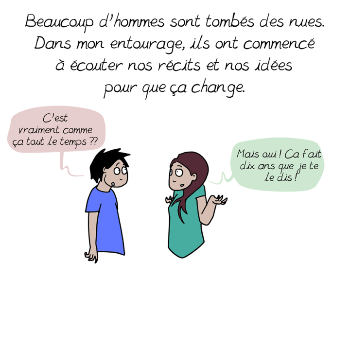“Então quando me dizem que lutando contra o assédio, as relações homens-mulheres serão distorcidas, eu tenho vontade de responder que é exatamente o inverso! Faz séculos que a relação homens-mulheres são distorcidas. Distorcidas pela nossa educação orientada pelo gênero, distorcidas pelo medo e pelos riscos que nós temos de ser agredidas. E nós, a gente luta para que isso mude.”