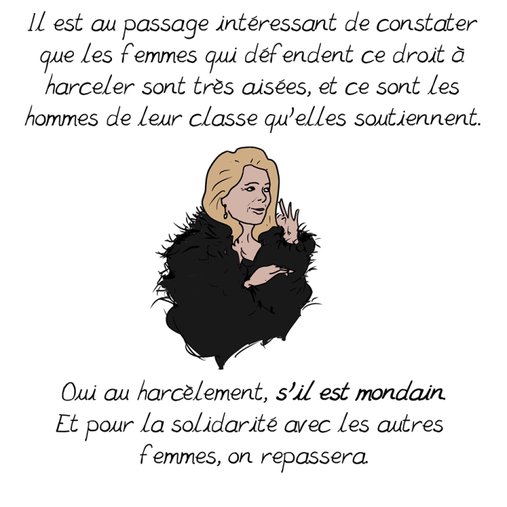 É interessante constatar que as mulheres que defendem esse direito a importunar são muito abastadas, e são os homens de sua classe que elas apoiam. Sim ao assédio, se ele é mundano. E quanto à solidariedade com as outras mulheres, a gente passa.