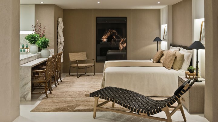 Silvia Bitelli homenageia Kazuo Miyamoto em um espaço valorizando o conceito slow life. Os destaques são os tapetes de fibra, os clássicos tapetes na cor nude e a cabeceira em veludo da cama Ayna.