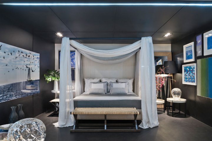 Roberto Cimino e Nelson Amorim se inspiraram em Malu Cimino para criar seu espaço. As peças mais interessantes são o sofá modular e a cabeceira da cama Zafra, que é bastante longa, abraçando quem dorme. Próxima à cama, uma bela pintura do artista Alison de Sando que pertence à coleção particular dos criadores do ambiente. Notem que o preto está sendo cada vez mais aceito na decoração de interiores.