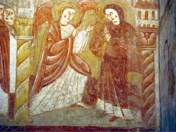 Os afrescos, datados provavelmente do século XII, que se localizam no diafragma – espaço que separa a nave do coro -, no coro e na abside contam, principalmente, a história da infância e da Paixão do Cristo, além da vida de São Martinho, a quem a igreja é dedicada, e alguns outros temas. Em volta das janelas e sublinhando outros detalhes arquiteturas, existe uma decoração anicônica, ou seja, sem imagens, constituída de fitas e elementos decorativos ocres e vermelhos. É importante notar que as pinturas representam uma segunda campanha de decoração da igreja, que, portanto, é um pouco mais antiga que estas. Não se sabe nada sobre as imagens anteriores que poderiam ter decorado o local.