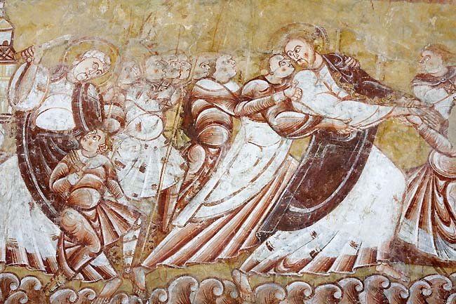 Através do estudo das imagens, os especialistas notaram que o pintor trabalhava da direita para à esquerda, em direção oposta ao sentido da história contada, sugerindo assim a existência de um plano complexo previamente estabelecido, que valorizava o significado alegórico em detrimento de representar uma simples narrativas em diversas cenas. As pinturas, a partir do diafragma, em oposição ao resto da igreja pintada de branco, mostra a divisão do espaço eclesiástico, o mais sagrado sendo decorado e o destinado aos fiéis apresentado em branco.