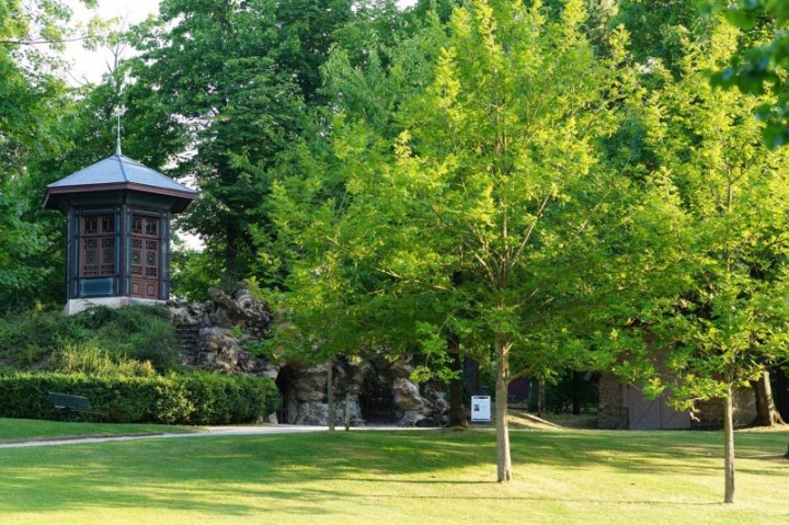 Enfim, eu pensava ter visto a originalidade do jardim com a gruta e a cabana, mas encontramos algo ainda mais insólito ! Trata-se do conjunto quiosque-refrigerador: ele é composto de uma refrigerador natural semisubterrâneo coberto de uma montanha de terra sobreposta por um quiosque. Uma gruta permite o acesso. Assim, podia-se conservar o gelo natural e os alimentos durante o verão.