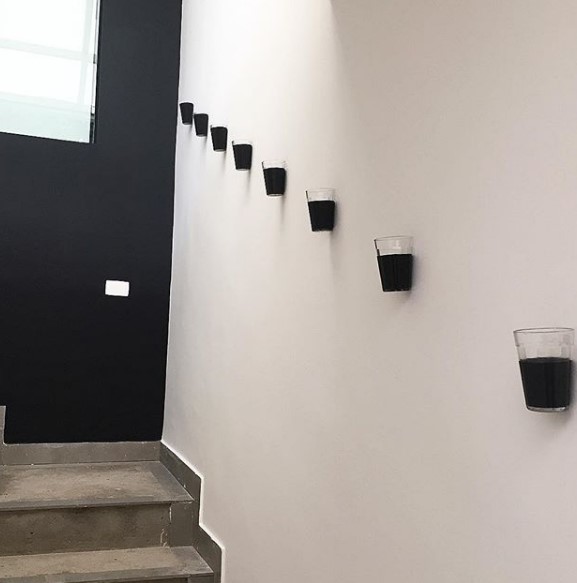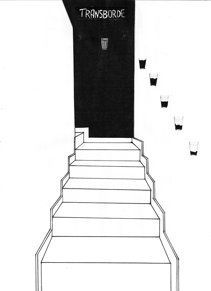 Transborde, no caso, é uma instalação site specific criada para ser mostrada nas paredes ao lado das escadas do Escritório de Arte e Centro de Estudos Ypsilone, dialogando assim poeticamente com a arquitetura do lugar. Os copinhos de café se enchem gradativamente, conforme sobem-se os degraus, para transbordar no final das escadas, mostrando assim a busca gradativa pelo conhecimento, que, após um certo período de tempo e de saber adquirido, transborda, possibilitando assim a criação. Já se dizia na Renascença, pintura é cosa mentale – coisa mental. Ou seja, o aprendizado e o contato com diversas formas de saberes é importantíssimo para o processo criativo. Como trata-se de um local de osmose cultural, no qual são oferecidos cursos de história da arte e cursos práticos de criação, a obra não poderia ser mais acertada.