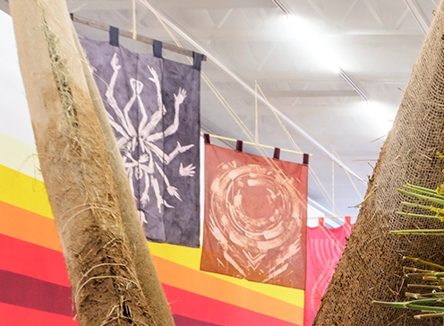 Os outros tecidos coloridos em volta do material orgânico que se decompõe trazem outros símbolos ligados a diversas religiões, principalmente aquelas de matrizes africanas e asiáticas. Vemos, por exemplo, os muitos braços do deus hindu Shiva e o que parece ser o Eruexim, instrumento feito de rabo de cavalo carregado por Oyá ou Iansã, a deusa guerreira dos ventos da mitologia Yorubá e do candomblé. Inclusive, a maneira como os ramos de flores encontram-se presos na obra também lembra elementos usados nas religiões de matriz africana. Na sala ao lado, havia outra instalação do artista, na qual vários recipientes em cerâmica e plantas repousavam sobre uma mesa, tal qual um altar pronto para a realização de um ritual.