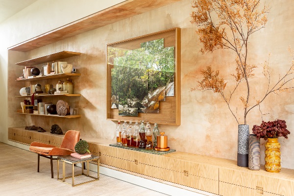Para Silvana Mattar e Flavia Gerab, as texturas foram muito importantes na hora de projetar a “Boutique Residence 218”. O espaço conta um biombo desenhado por elas, em fibra sintética, para mais fácil manutenção, armário com as portas revestidas em couro e madeira ripada na parede da sala.