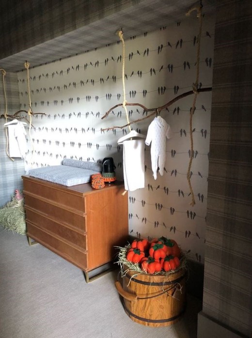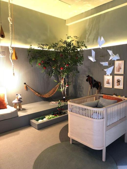 Por último e não menos importante (estou seguindo a ordem dos ambientes da mostra), as meninas da MN Interiores nos trazem “O Quarto do Bebê”, onde representam a “Casa Viva” através da horta com legumes confeccionados em feltro e dos animais presentes no projeto, tudo muito lúdico. Além do tema, o que me chamou atenção foi a requintada escolha de tecidos, ponto importante quando se trata de um quarto de bebê, como o tecido com pássaros bordados revestindo a parede.