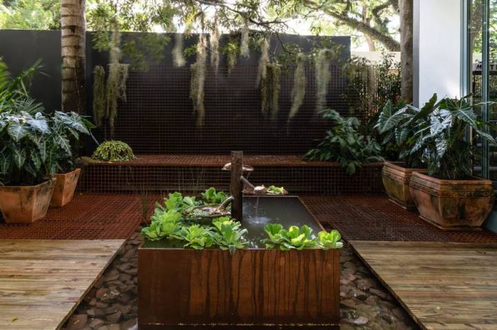 Roberto Riscala criou um jardim tão bem humorado quanto ele, além das orquídeas sobre a estrutura que aterrissa sobre o paisagismo, encontramos plantas comestíveis em todo paisagismo baixo do projeto.