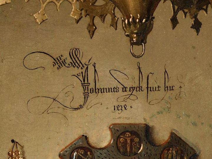 Sobre a questão da assinatura, o artista geralmente assinava suas obras em latim, assim como vemos no Retrato de um homem, na moldura do qual está escrito “JOHES DE EYCK ME FECIT ANO MCCCC.33. 21. OCTOBRIS” – “JAN VAN EYCK ME FEZ EM 21 DE OUTUBRO DE 1433”-, ou sobre o espelho no quadro dos esposos Arnolfini, onde há a frase “Johannes de eyck fuit hic 1434”- Jan van eyck esteve aqui 1434”. A moldura da obra estudada, que provavelmente continha a assinatura do artista e o ano exato de sua execução, foi perdida quando da sua transferência ao Louvre, em 1793, quando da destruição da igreja para qual foi criada, durante a Revolução Francesa.