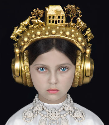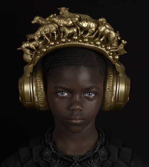 Outro ponto que aparece nessa fotografia que é bastante frequente nas criações de Adriana, e até já foi tema de disputa com a Dolce & Gabbana, que o teria copiado, são os fones de ouvido – com bluetooth? – que parecem coroas. Aqui, este aparece dourado, com animais de fazenda sobre a cabeça, entretanto, a fotógrafa confeccionou ela mesma, desde 2011, diversas outras variações do acessório que lembra tiaras e capelos de outros séculos, com pérolas e pedrarias.