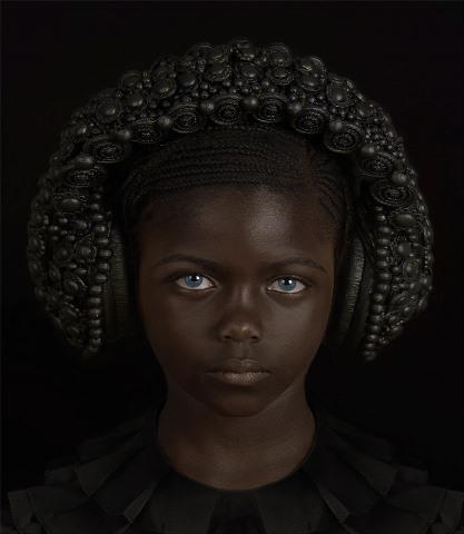 Acredito que o fato de os olhos serem sempre azuis seja devido à referência constante em suas obras à colonização europeia na América Latina – a artista é colombiana –, ou seja, a invasão e a imposição da cultura da Europa aos povos locais e aos negros trazidos escravizados. Na fotografia Menina 10, os “obrigatórios” olhos azuis ficam mais evidentes, dado que a menina é negra e muito dificilmente possuiria olhos nessa cor, tornando a imposição cultural, inclusive a imposição de beleza física, ainda mais explícita através desse contraste. A menina através de seu olhar penetrante parece se rebelar, apesar de permanecer imóvel e adornada.