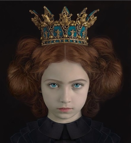 Adriana Duque, sobre a qual já falamos na coluna Obra de Arte da Semana, fotografa crianças sérias em retratos inspirados na pintura dos séculos passados, usando, frequentemente, belíssimos acessórios, tal qual a coroa da foto. O fundo quase sempre é preto nesses retratos nos quais os rostos estão bem próximos e os olhos são sempre digitalmente modificados para mostrarem a cor azul, aqui em perfeito diálogo com o azul da coroa.