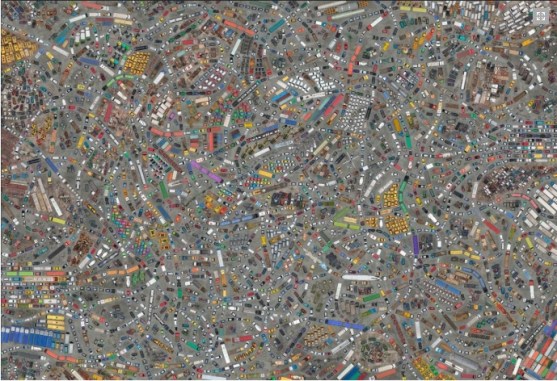 As obras de Cássio Vasconcellos são bem lúdicas. Ele primeiro faz fotografias aéreas e depois cria imagens incríveis através de montagens, assim o espectador, de longe, vê algo quase abstrato, mas, chegando perto, percebe que a imagem é composta de inúmeros elementos, no caso dessa fotografia, carrinhos, caminhões e containers.