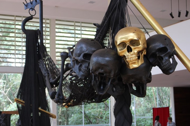 Um dos temas que mais me toca é a morte e a passagem do tempo, e este é mostrado claramente na primeira obra que vemos ao entrar na Galeria Piscoativa Tunga, com um imenso esqueleto sem cabeça deitado sobre uma rede, e crânios pendurados de um dos lados da rede, também sem o uso da solda. As bengalas presentes em várias de suas obras seriam aqui uma alusão à velhice? A trama da rede e os fios me lembram também a tapeçaria do destino tecidas pelas parcas ou moiras da mitologia greco-romana.