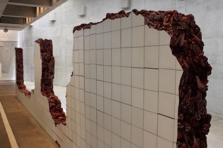 Na Galeria Adriana Varejão, temos algumas obras da artista de mesmo nome que foi uma das fundadoras do Inhotim, junto ao empresário Bernardo de Mello Paz, na época seu marido. O local surgiu para abrigar a coleção de arte do casal e foi crescendo até se tornar o que é hoje. A criação mais interessante desse pavilhão, em minha opinião, é a Linda do Rosário, inspirada no desabamento do hotel de mesmo nome em 2002, no Rio de Janeiro. Entre as paredes de azulejos brancos despedaçada, fazendo alusão àqueles que caíram sobre um casal em um dos cômodos do prédio – os azulejos também são a marca registrada da artista -, vemos o que parecem órgãos, lembrando o desastre. Se o visitante olhar para cima, verá no alto pinturas de plantas carnívoras em vermelho, em uma perfeita alusão à carne entre os azulejos e a carne que seriam devoradas pelas plantas.