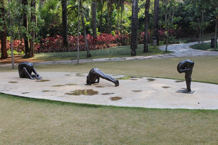 Antes de seguir nossa visita através das palavras, é importante notar que o Inhotim é bem grande e sem o auxílio dos carrinhos de golfe, e ainda assim se apressando bastante, é difícil ver tudo em um dia só. Quem tiver tempo, pode dormir em Brumadinho e fazer a visita em dois dias, mas a maioria das pessoas acaba vendo o lugar em somente uma jornada. Assim, fiz uma seleção de minhas obras favoritas, sobretudo aos que pretendem visitar o Inhotim durante um dia só. A ideia é comentar um pouco de cada uma dessas obras e depois escrever sobre elas na coluna Obra de Arte da Semana, já que outro problema que encontrei durante minha visita foi a falta de informação sobre algumas das criações apresentadas. Há, sim, placas explicativas com o nome do autor e algo sobre seu trabalho, entretanto, como arte contemporânea não é de fácil entendimento, principalmente para os leigos, acredito que algo mais direto e especifico sobre a obra apresentada, não somente sobre o trabalho do artista no geral, poderia ser muito interessante. Se essa que vos escreve, artista, graduada em história da arte, lendo sempre sobre o assunto e habituada a visitar exposições de arte contemporânea não entendeu algumas obras, imagine quem não está acostumado a ter contato com obras de arte? No ônibus de volta, alguns de nossos colegas de transporte comentavam superficialmente como o local era bonito – é possível visita-lo só pelo seu paisagismo e contato com a natureza, por que não? – e as obras interessantes, porém os comentários eram clichês e superficiais, pois eles simplesmente pouco haviam entendido das obras propriamente ditas e, mesmo assim, me parecia que eles tinham sede de compreendê-las. Posteriormente, uma amiga me disse que os funcionários que ficam na porta das galerias sabem informar os visitantes sobre seus conteúdos, então, vale a tentativa de perguntar. Outra opção interessante é a visita mediada, com um monitor explicando algumas das obras ao espectador.