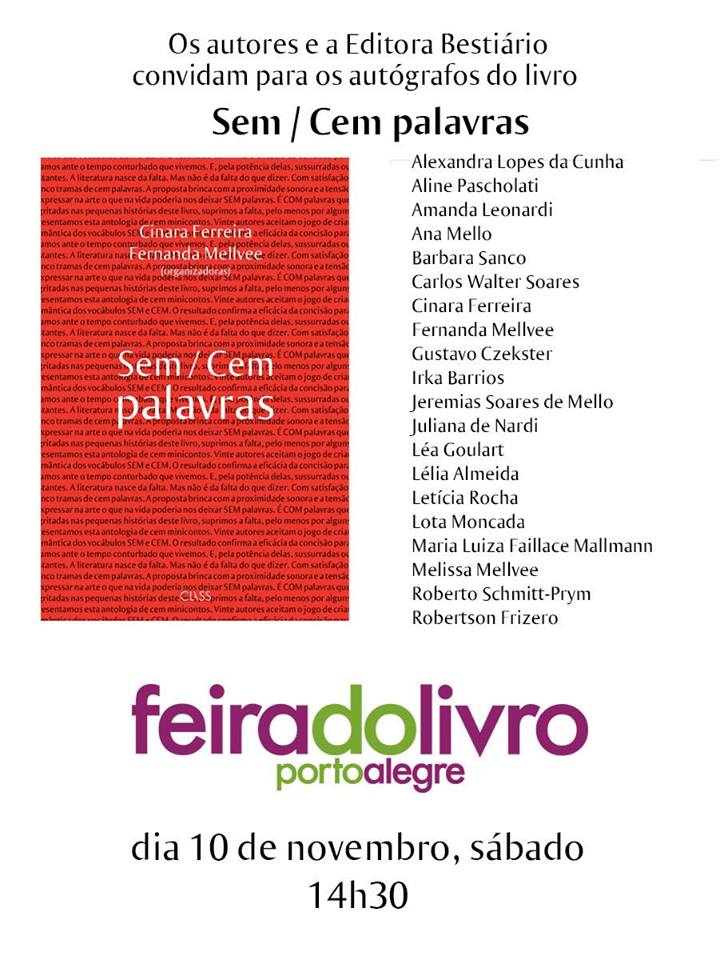 Hoje eu vou falar um pouco sobre a antologia Sem/Cem palavras da qual eu participei. O livro é formado por vinte autores, entre eles as organizadoras: Cinara Ferreira e Fernanda Mellvee (que é a minha mãe). A sessão de autógrafos na Feira do Livro de Porto Alegre será no dia 10/11 (no próximo sábado). Eu indico muito ler esse livro pelo fato de que temos histórias de todos os tipos. Mas como assim? Simples, cada autor escreveu cinco contos de cem palavras, e esses contos são de todos os gêneros. Exemplos: terror, literatura fantástica, histórias de amor, entre outros… Eu amei participar dessa antologia, e espero que vocês gostem!