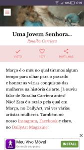 Nos dias de hoje, para quase tudo tem um aplicativo que facilita a nossa vida. Se precisamos de transporte, tem um Uber, ou 99 ou Cabify, se precisa de comida, tem iFood, UberEats, entre outros, se quer falar com alguém por mensagens, tem Whatsapp, Facebook, etc. E agora, quando você quer é aprender mais sobre arte, mas não tem tempo de filtrar as diversas páginas que aparecem quando você pesquisa no Google sobre o assunto, ou simplesmente não tem um tópico específico sobre a história da arte o qual você queira conhecer, mas gostaria de aprender mais sobre obras de arte modernas e contemporâneas em geral? Para isso surgiu o DailyArt, um aplicativo, disponível para Android, iPhone e iPad, em que você pode fazer buscas e explorar um acervo de mais de 3.000 obras-primas, ler as biografias de 780 artistas e tenha acesso a informações sobre o acervo de 500 museus, adicionar obras aos seus favoritos e também compartilhar tudo isso com amigos e familiares.