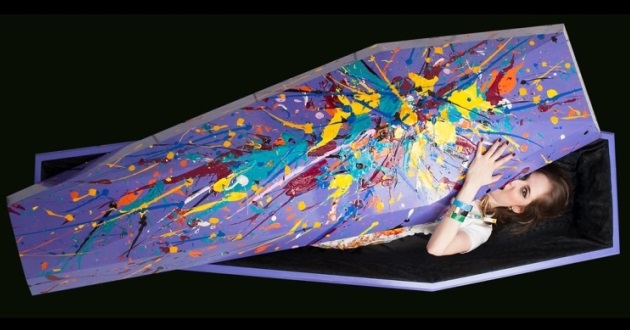 O meu caixão-obra de arte como visão otimista da morte, definitivamente. A oportunidade de pintar em um suporte tão incomum foi incrível e o tema da morte é um dos mais importantes para mim. Nessa obra, me inspirei do mito grego de Eros e Psiquê sobre a imortalidade da alma.