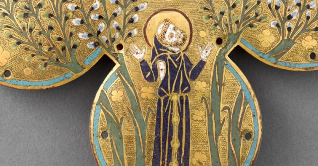 Relicário de São Francisco de Assis, madeira, esmalte champlevé sobre cobre dourado e cristais, 36cm de altura, 1228-1230. Depósito do Museu do Louvre no Museu Cluny – Musée du Moyen-Âge, Paris, França.