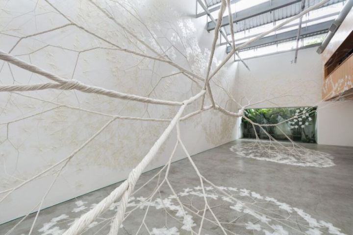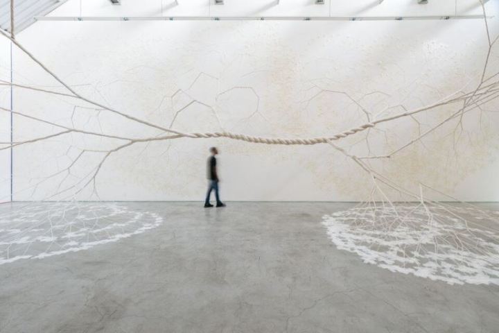 O resultado é uma estrutura branca, suspensa por fita crepe quase branca, em paredes também muito brancas, criando assim uma atmosfera que senti como imaculada e atemporal.