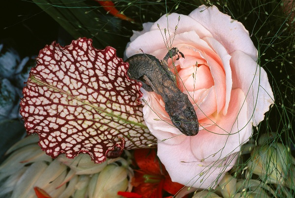 Para o artista, as flores e suas camadas de pétalas possuem uma forma próxima ao sexo feminino, e, nessa imagem, a lagartixa por sua forma alongada lembra o órgão genital masculino. O rosa delicado das pétalas e sua textura lisa, quase artificial, contrasta com a cor escura do réptil e sua aparência áspera, réptil este que, inclusive, está morto. À luz dessa última informação, podemos notar que há também nessa imagem uma oposição entre vida e morte, vida, entretanto, que é extremamente efêmera, como nos indica a fragilidade da flor.