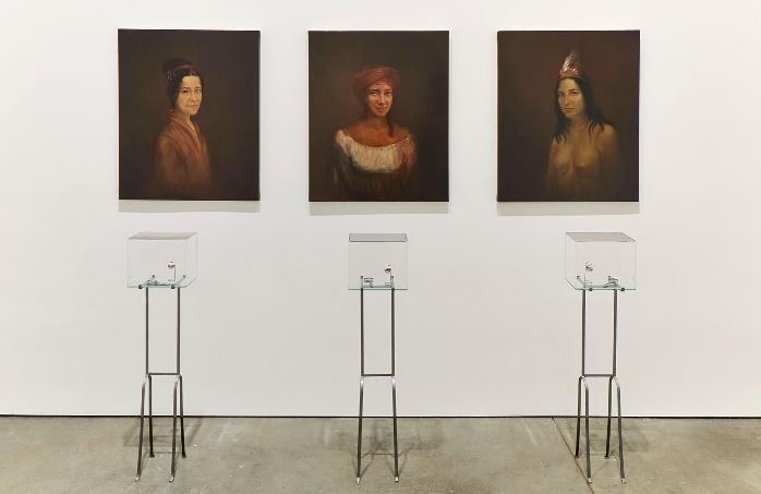 Adriana Varejão, Testemunhas oculares X, Y, Z, 200 x 250 x 35 / 85 x 70 cm cada tela / 16 x 88 x 25 cada objeto, instalação: óleo sobre tela, porcelana, fotografia, prata, vidro e ferro, 1997. Coleção particular.
