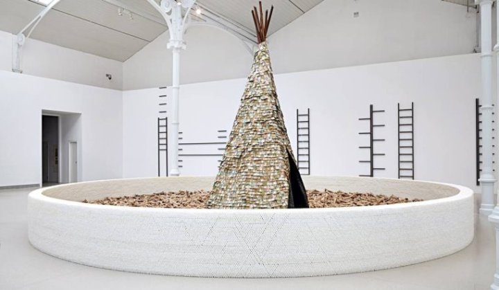 Assim, o que vemos nessa instalação é uma cabana indígena da América do Norte composta por notas de dinheiro de países do continente americano, os quais foram colonizados pelos europeus e tiveram suas populações indígenas escravizadas e massacradas. Em volta da tenda, uma tonelada de ossos bovinos – tíbias e fêmures – são contidos por um círculo de 70.000 velas brancas, que, não são coladas ou presas de alguma maneira, mas foram somente colocadas umas sobre as outras. De dentro da tenda, onde há carvão, provém o som do que parece ser uma motosserra.