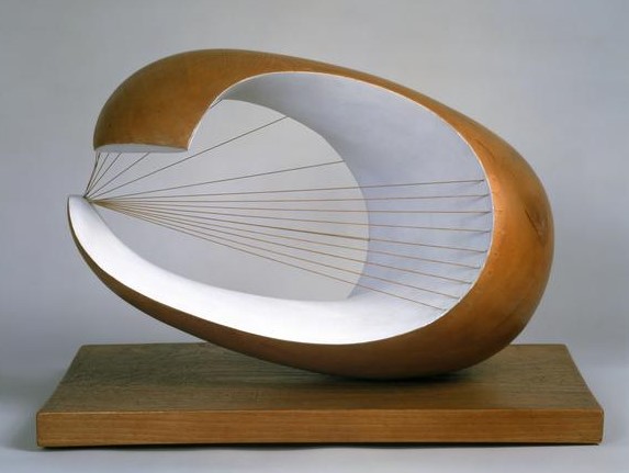 Barbara Hepworth, Pélagos, olmo, cordas e pintura sobre base de carvalho, 43 x 46 x 38,5 cm, 15,2 kg, 1946, Conservada na Tate, em Londres, Reino Unido.
