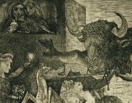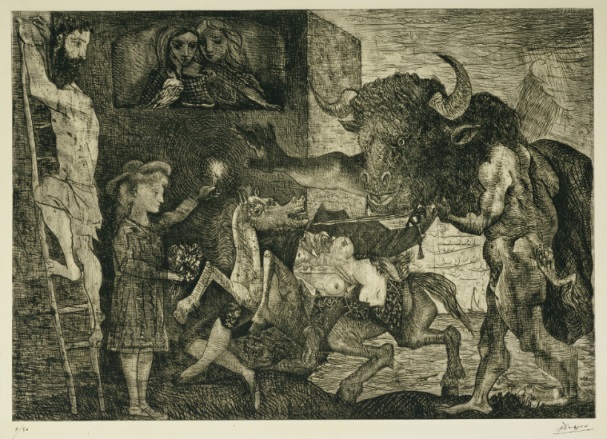 Pablo Picasso, Minotauromaquia, água-forte (gravura), 57,4 x 74,2 cm, 1935. Conservada no Museum of Modern Art, Nova Iorque, EUA.