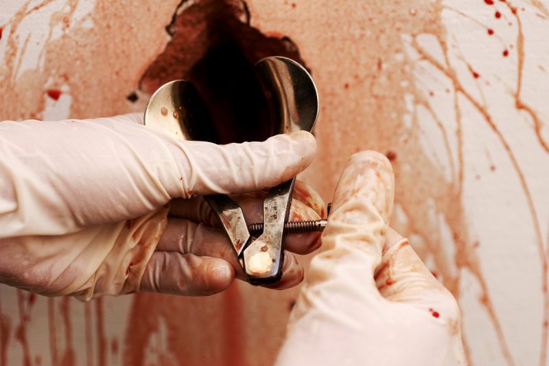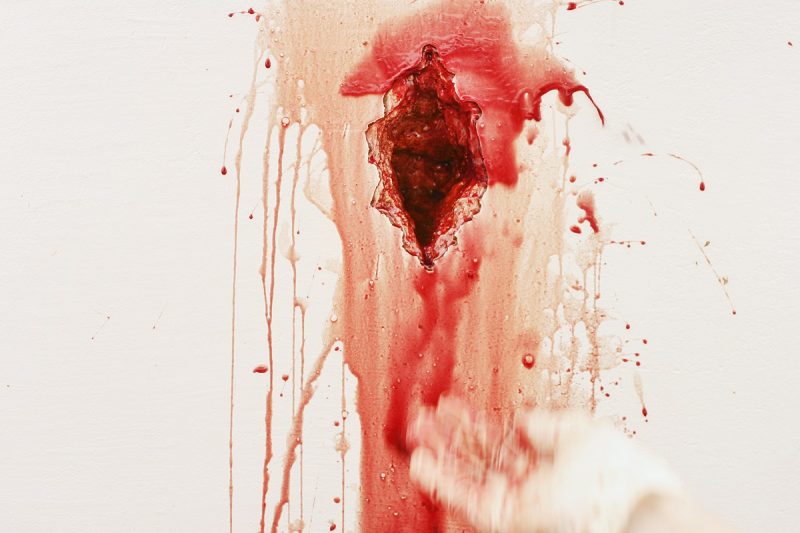 A cor vemelha, ou seja, do sangue, também faz referência à violência, e, nesse ponto, podemos pensar nas várias formas de violências praticadas contra os corpos femininos, acredito que desde aquelas voluntárias, tanto para se alcançar a tão sonhada beleza, quanto, por exemplo, nas cesarianas forçadas, até o assédio e o estupro. A artista já trabalha há muito tempo com essa temática, como testemunha sua performance Dra. Diva, na qual ela, vestida com roupas de enfermeira, abre um buraco na parede imaculadamente branca e coloca sangue de boi que escorre de seu interior, tal qual uma ferida aberta ou uma vagina. Depois, um espéculo ginecológico é introduzido na abertura.