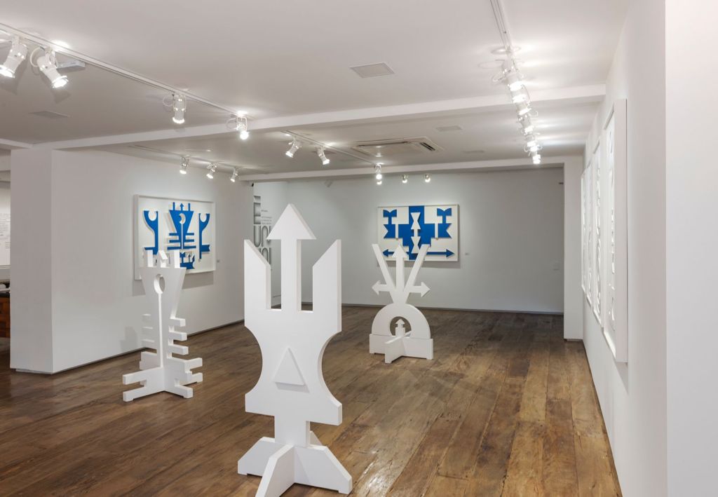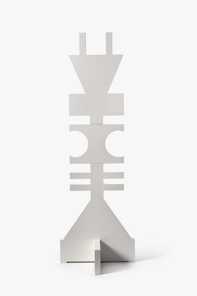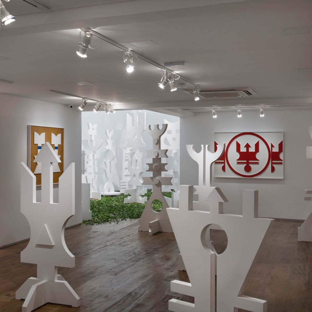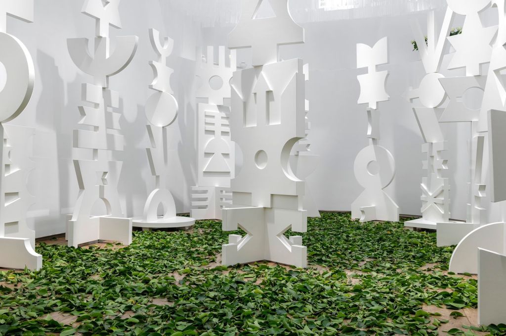 Oxalá, também chamado de Obàtálá, é o mais importante do panteão iorubá – um dos maiores grupos étnicos-linguísticos africanos, ao qual pertencia a maioria dos escravizados trazidos para o Brasil. Esse deus é ligado à criação do mundo e dos homens, sendo associado ao Cristo no sincretismo da umbanda. Ainda é importante notar que a palavra “Obàtálá” significa “o senhor do pano branco”, com o branco como cor predominante do orixá e das representações em Templo de Oxalá. Já o título da mostra, Ilê Funfun, faz referência à cor branca através da palavra “funfun”, enquanto que “ilê” significa “casa” ou “terreiro” no idioma iorubá. Assim, vemos esculturas imaculadamente brancas, que remetem à luz, e parecem tanto símbolos mágicos, quanto totens, no caso daquelas em ronde bosse, ou seja, que se desprendem de uma superfície vertical, podendo o espectador andar ao seu redor. São figuras de seu próprio universo recriadas através de figuras geométricas.
