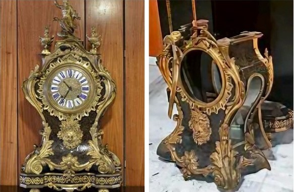 Relógio criado por Balthazar Martinot, que pertenceu a Dom João VI, em pedaços. Existe apenas outra peça do relojoeiro de Luís XIV, conservada no Palácio de Versalhes, na França, mas possui metade do tamanho daquela destruída;